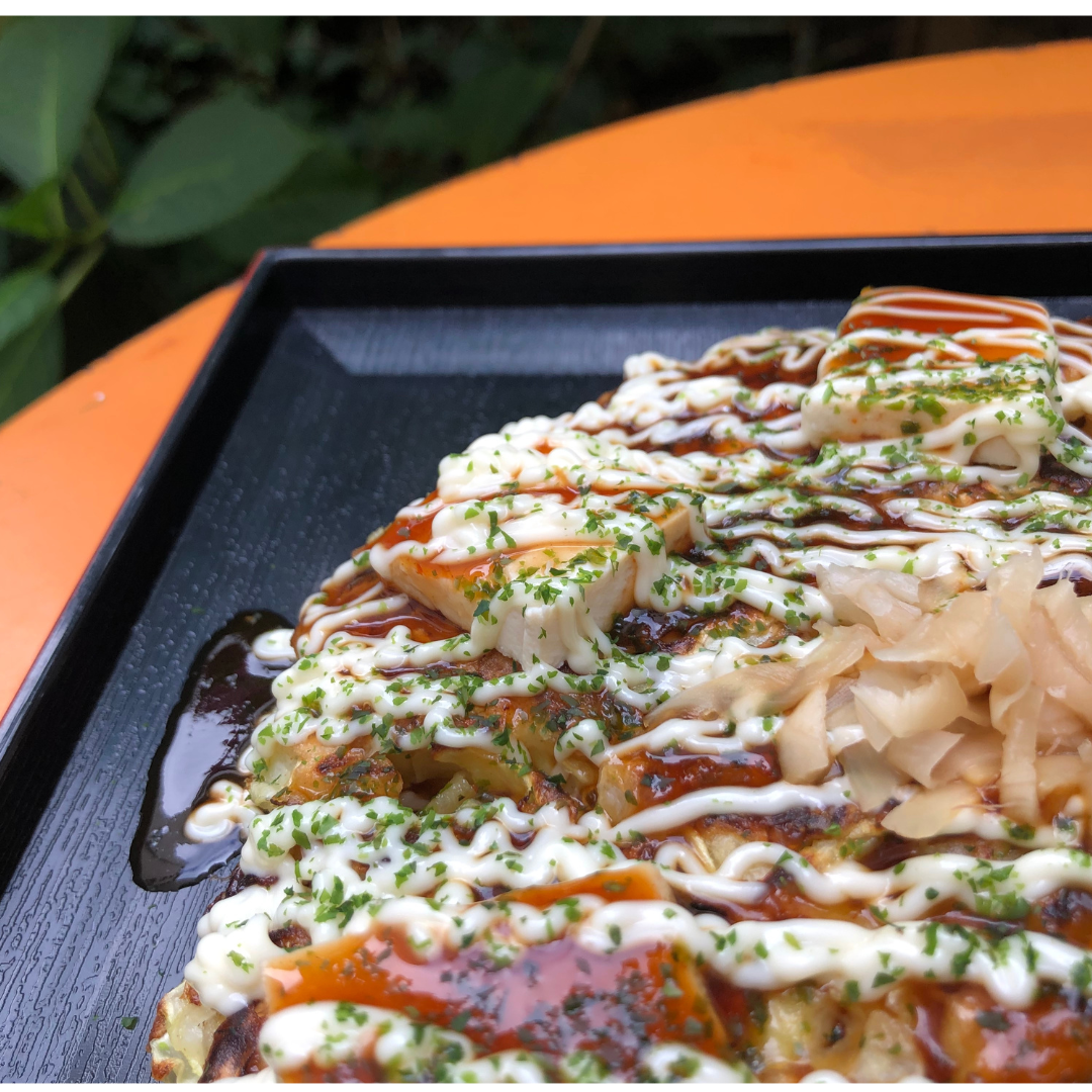 Gemüse Pfannkuchen mit entweder Tintenfisch oder Speck oder Tofu für Vegetarisch