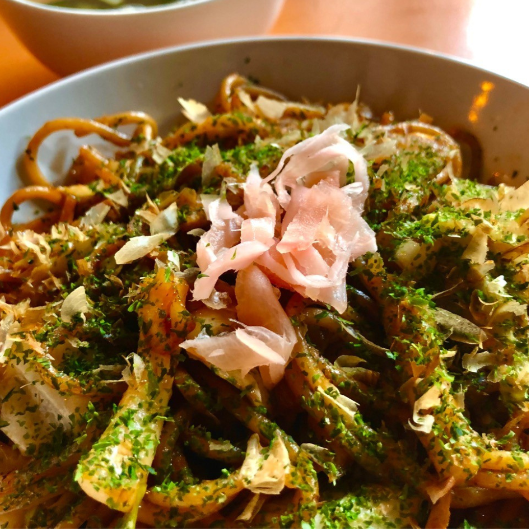 Nudeln, Kohl, Zwiebeln, Ingwer, Sojasauce, Sake, Mirin, Tomatenmark, Orangensaft, Braunzucker, Worcestersauce, Algen, Natron
